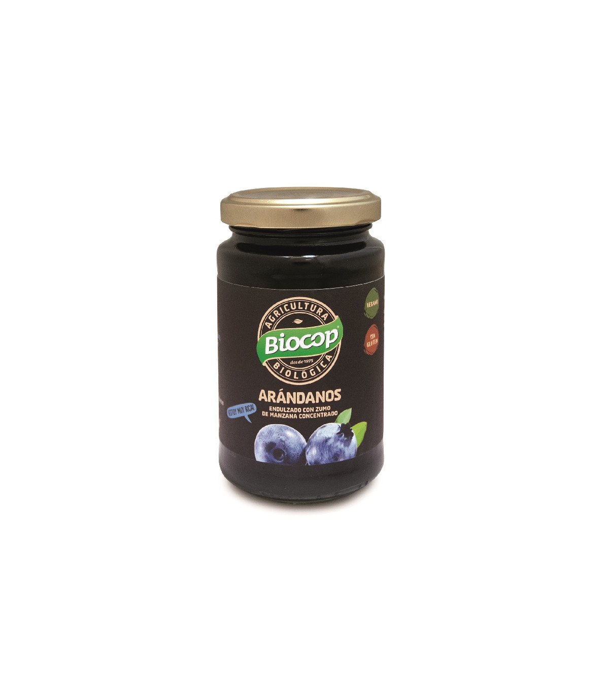 Compota de arándanos. Elaborada con arándanos maduros mediante cocción mínima para garantizar todo el sabor y aroma de la fruta. Endulzado con concentrado de zumo de manzana.