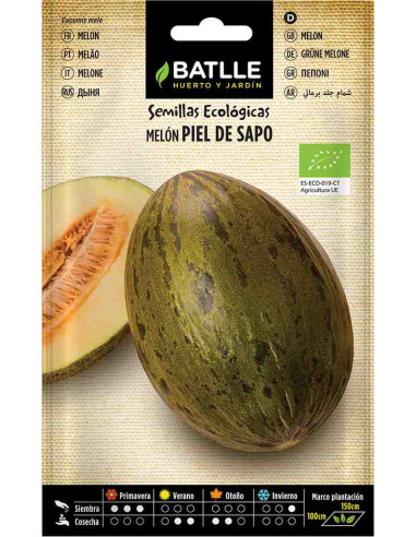 Semillas de Melón Piel de Sapo sel. Torpedo, una variedad robusta y de alta producción, ideal para cultivo doméstico o profesional. Produce frutos de gran tamaño con carne dulce y crujiente, perfecta para los meses de verano.